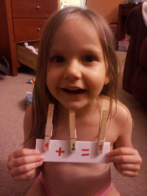 So we moved to some simple math.  The same set of clothespins with numbers, I just made a two sided card.  This side had a "+" and "=" while the other side had "-" and "=" on it.  She could clip them on, add them up, then clip the solution.  The cool thing about this is that even though she hasn't grasped subtraction yet, when you turn the card over the clothespins that say "4+1=5" on this side will say "5-1=4" on the reverse.  So when she gets to subtraction she'll be able to see the two working together.